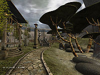 Upon first emerging from the tunnel from the fountain area visitors are met with the sight of strange brain like trees called Trooms. A path past the Trooms splits off into two with one path descending down a flight of stairs to the Puffer garden and another path curving around past the Hanging Ivy to a floating statue. Eder Kemo is one of two Ages that contain these floating stone figures with a similar statue being found in Eder Delin. The statue is a representation of a D'ni person. Whilst the stone figure shares traits found in other D'ni artworks (an emphasis on the shoulders to down play the elongated heads of the D'ni) the art work actually originates from the Age of Rebek.